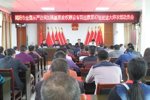為深入貫徹落實揭陽市委六屆六次全會精神,揭陽市全面從嚴治黨加強基層政權(quán)建設(shè)專項巡察組將進駐普寧各鄉(xiāng)鎮(zhèn)場街道,對普寧市28個鄉(xiāng)鎮(zhèn)場街道568個村(社區(qū))黨組織(延伸到村民小組)開展為期三個月的全面從嚴治黨加強基層政權(quán)建設(shè)專項巡察。2019年3月19日,揭陽市全面從嚴治黨加強基層政權(quán)建設(shè)專項巡察第47組組長吳振旭帶領(lǐng)其他成員共3人進駐大坪農(nóng)場。3月20日上午,大坪農(nóng)場召開市全面從嚴治黨加強基層政權(quán)建設(shè)專項巡察工作動員會議,會議由場黨委書記官錦周同志主持,參加會議的人員有揭陽市委專項巡察組全體同志,普寧市掛鉤大坪農(nóng)場領(lǐng)導(dǎo),場機關(guān)全體干部職工、村(社區(qū))“兩委”成員、鄉(xiāng)賢咨詢委員會代表及村民代表等40多人。